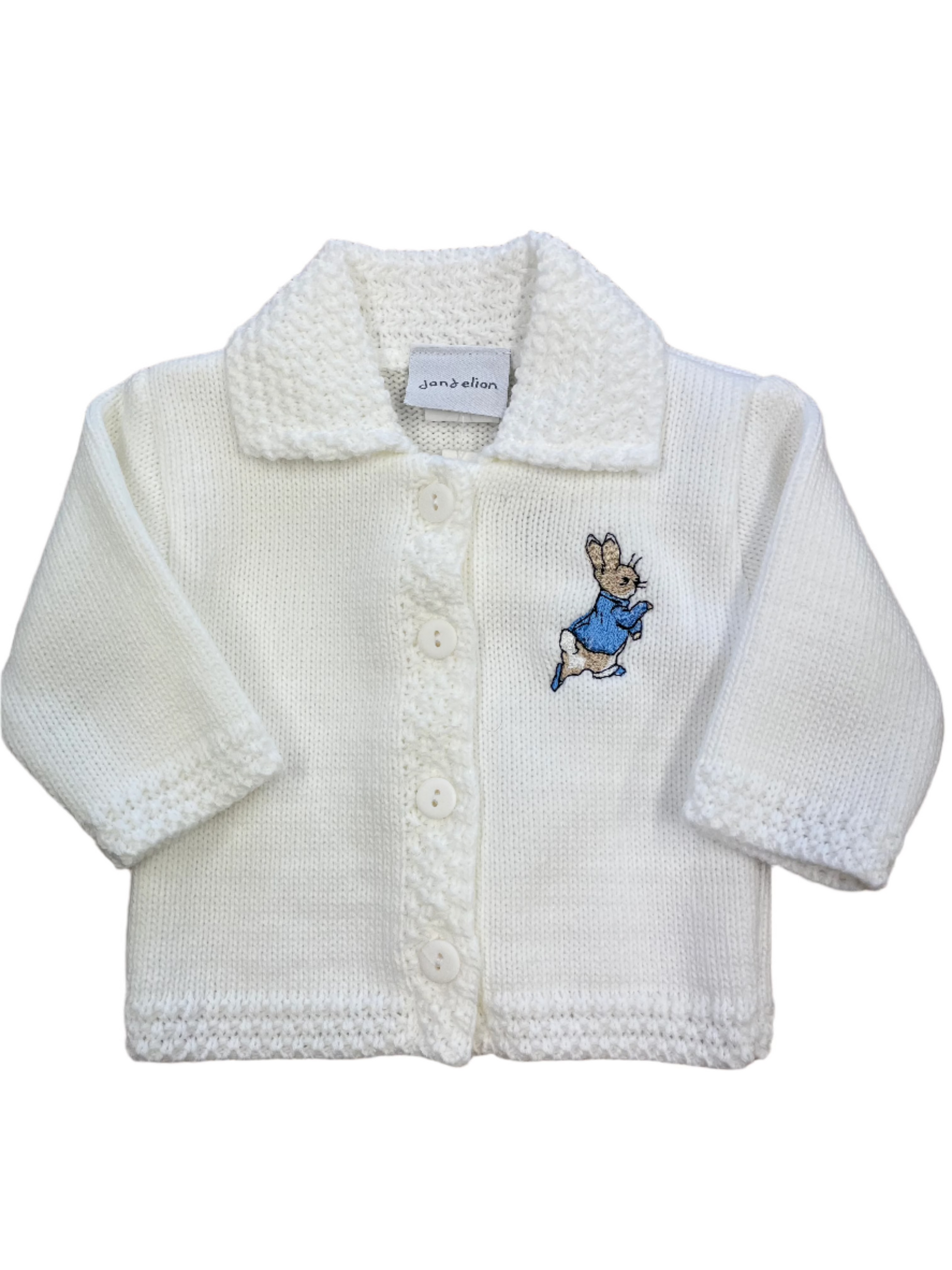 Beautiful traditional quality knitted cardigans from Dandelion Knitwear Embroidered with Peter Rabbit to chest.