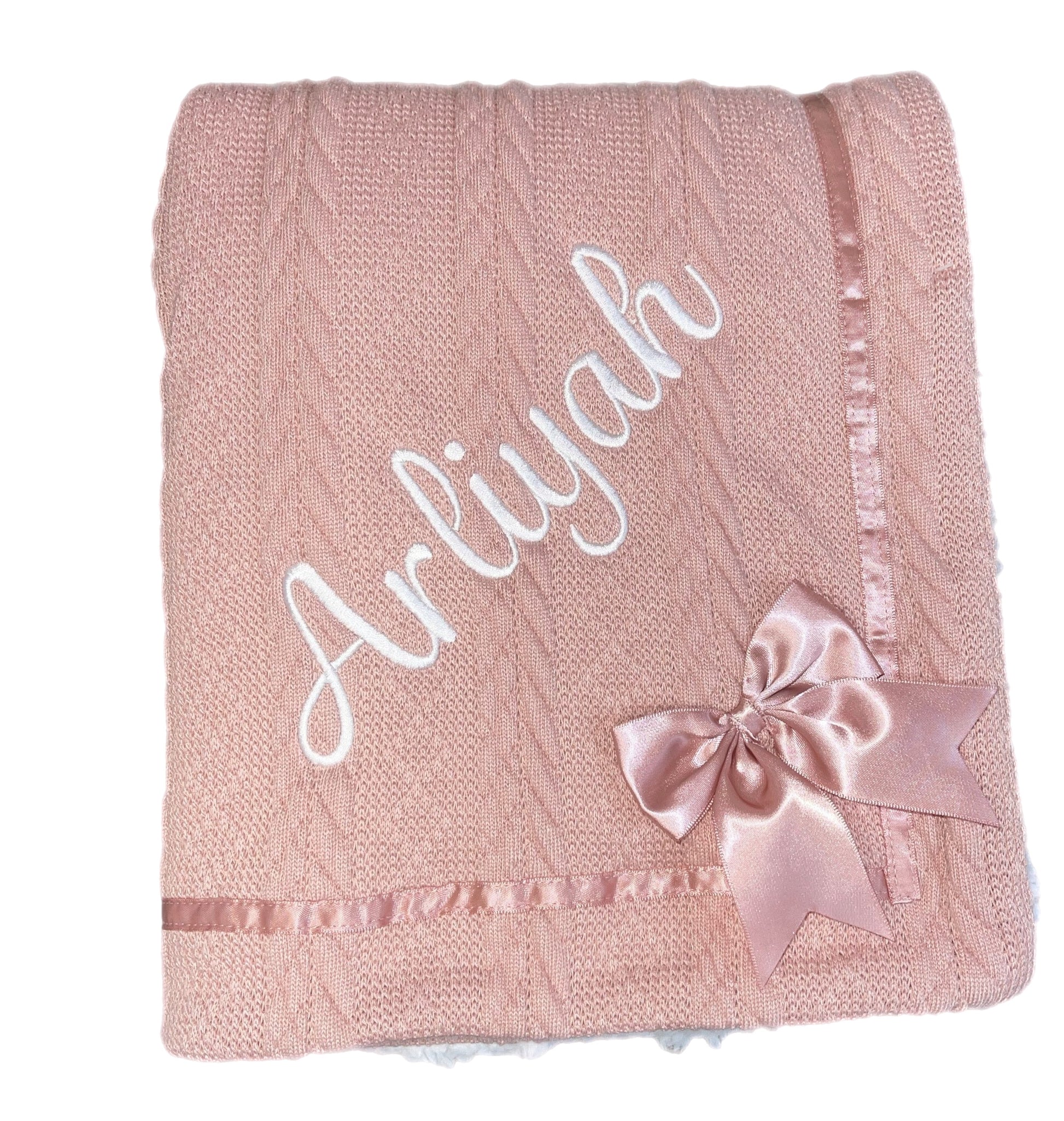 Personalise this Stunning Cable Knit Bow blanket upto 12 characters, with a sherpa fleece backing
