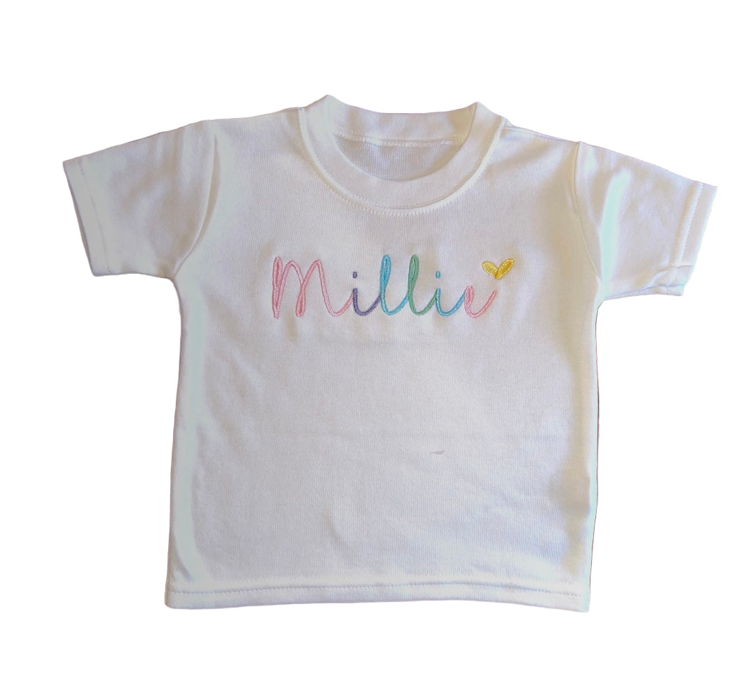 Short sleeved white cotton T-shirts personalised with your choice of 1st name in our rainbow colour embroidery, we can change the colours to blues or to any single colour or colour combination you would like
