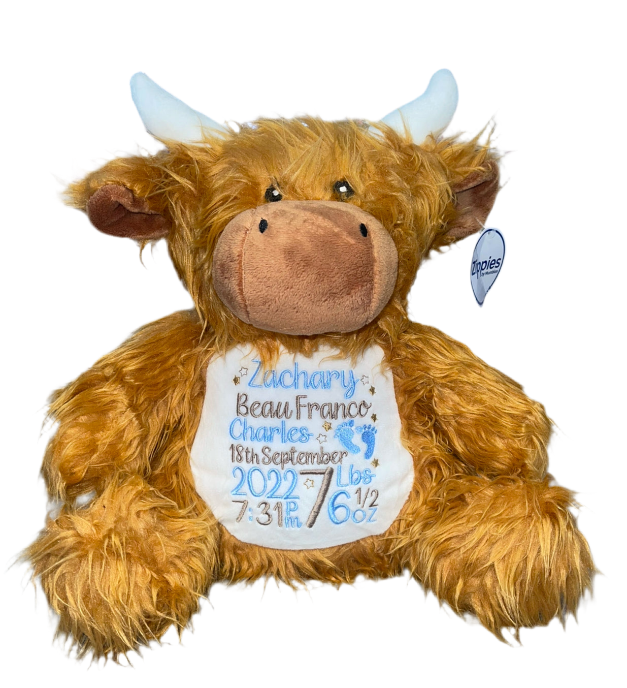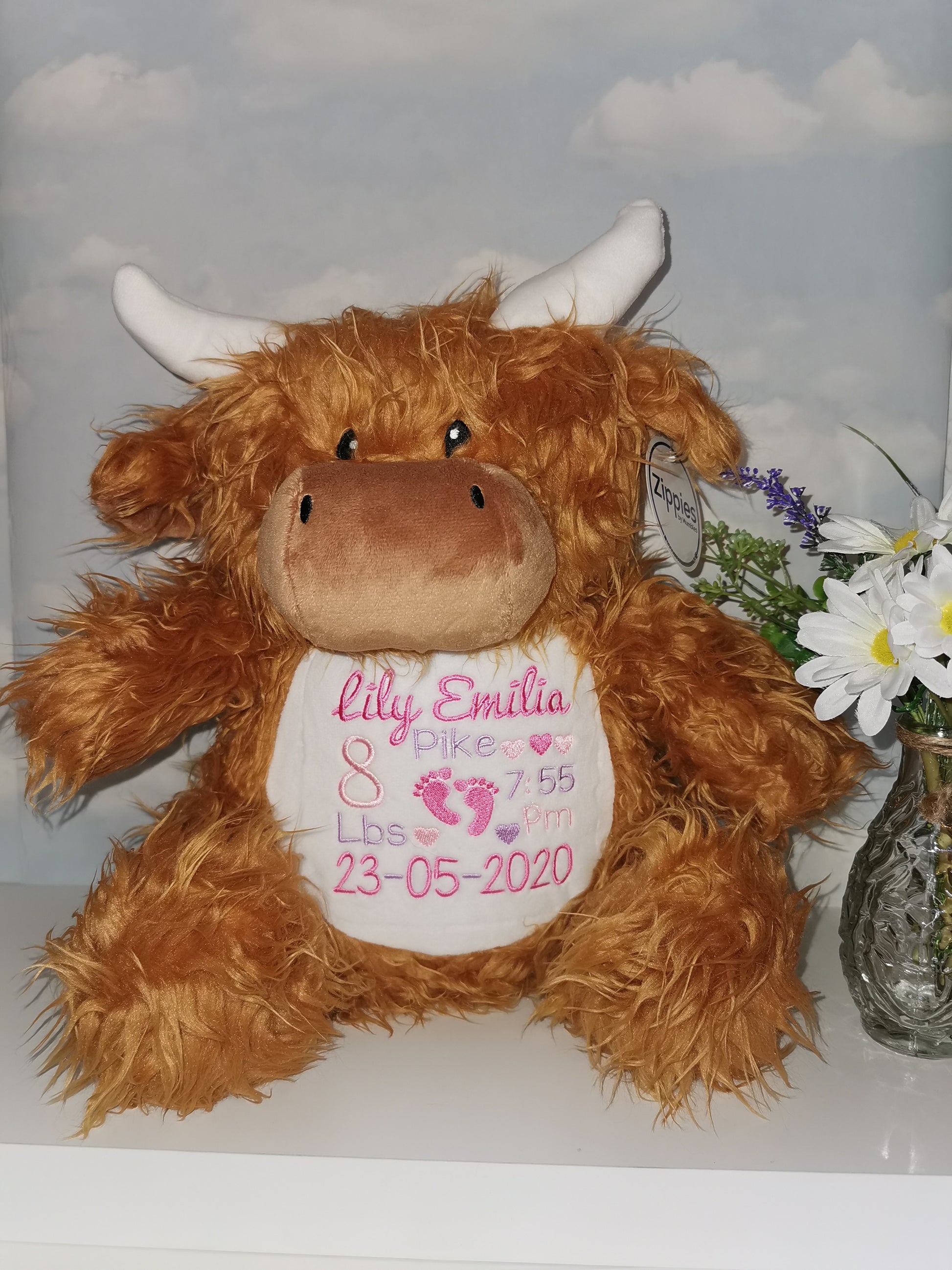 Our Highland cow teddy is a completely unique cuddly toy that can be personalised with a variety of embroidered design and colours