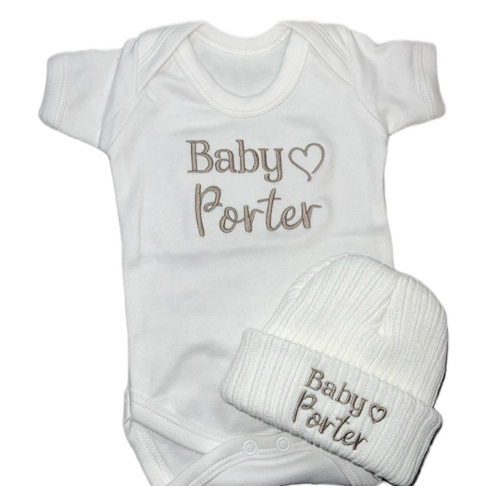The hat & vest will both be lovingly embroidered with your choice of name, Baby………. Colour embroidery will be done in a neutral colour unless otherwise stated