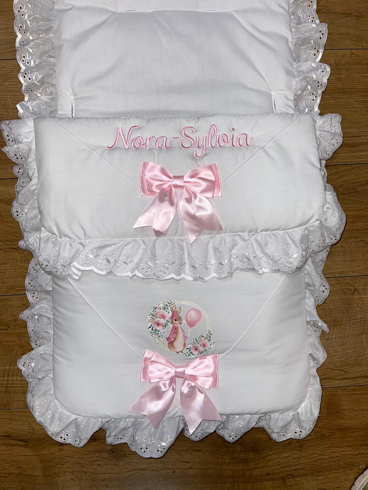 These are white with a pink bow and a fab rabbit print, with a space on the front to have a name embroidered on should you wish (max 11 characters)