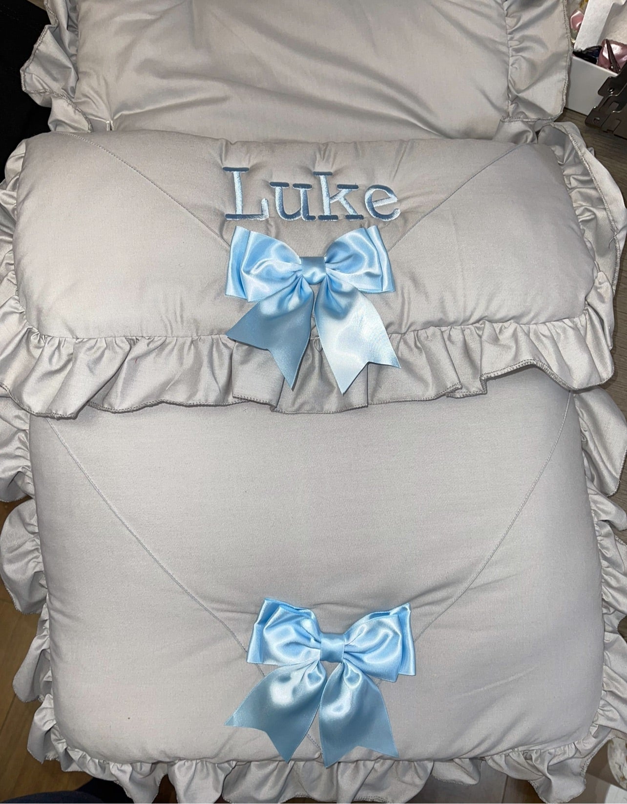 Personalised Two Bow Grey & blue Cosytoes