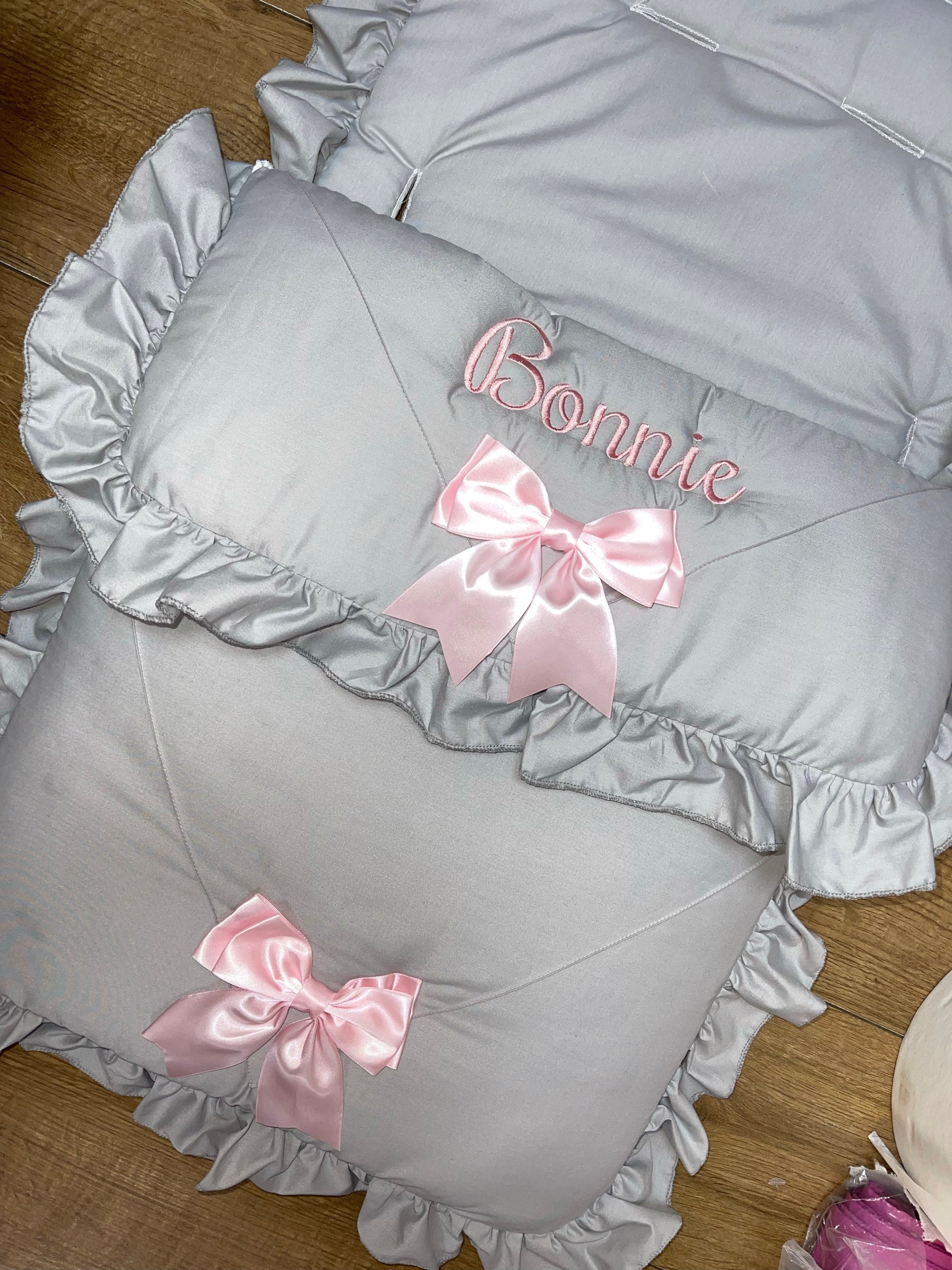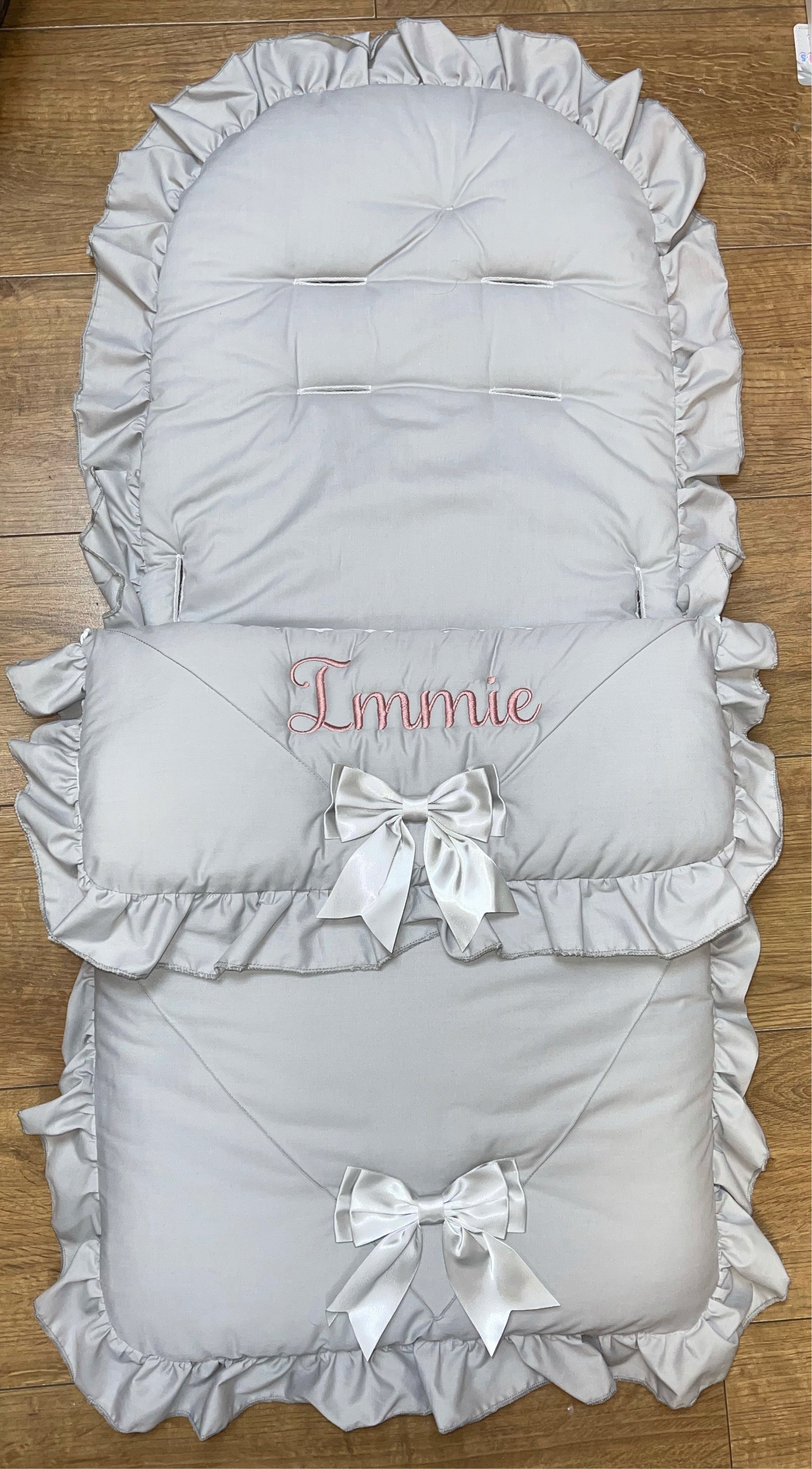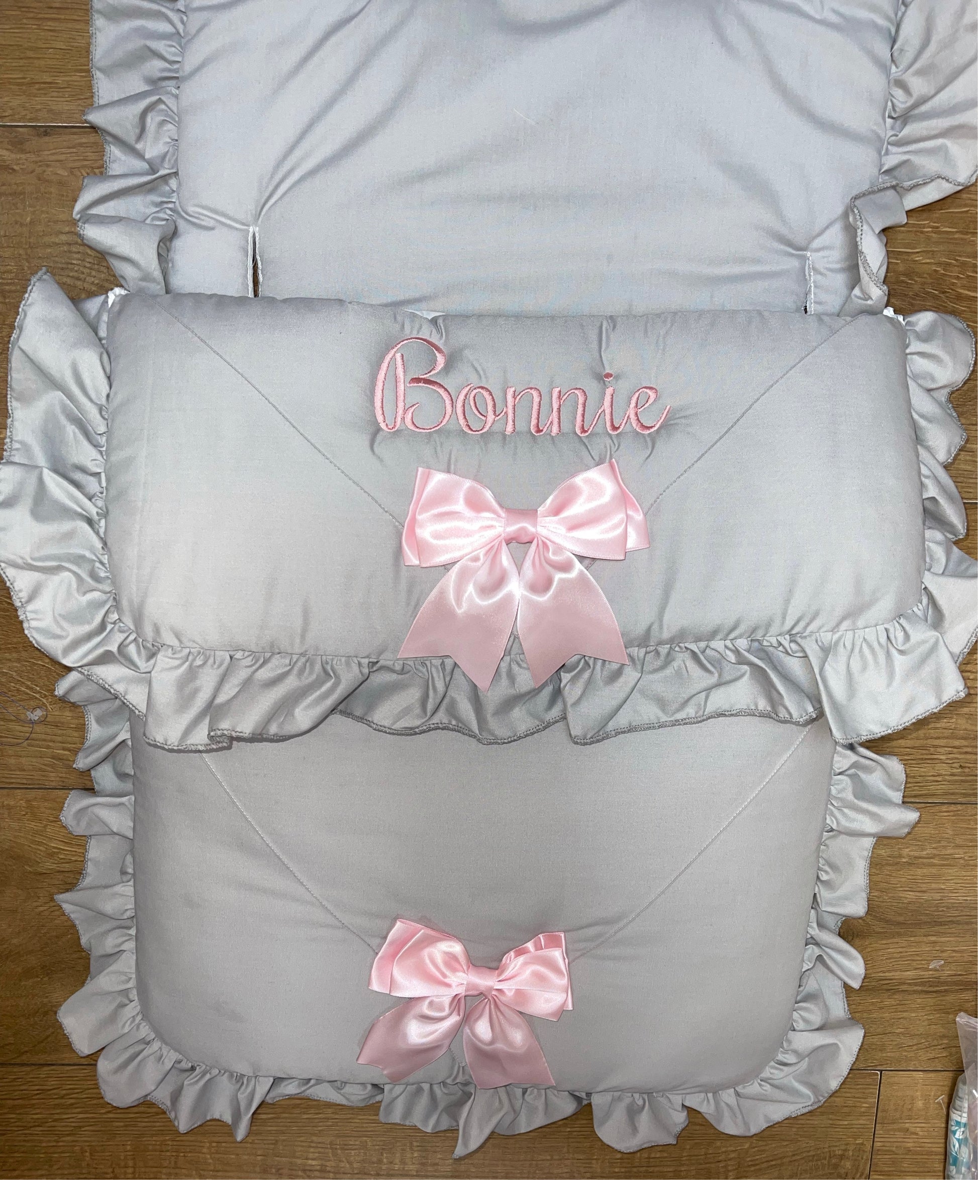 Personalised Two Bow Grey & pink Cosytoes / foot muff